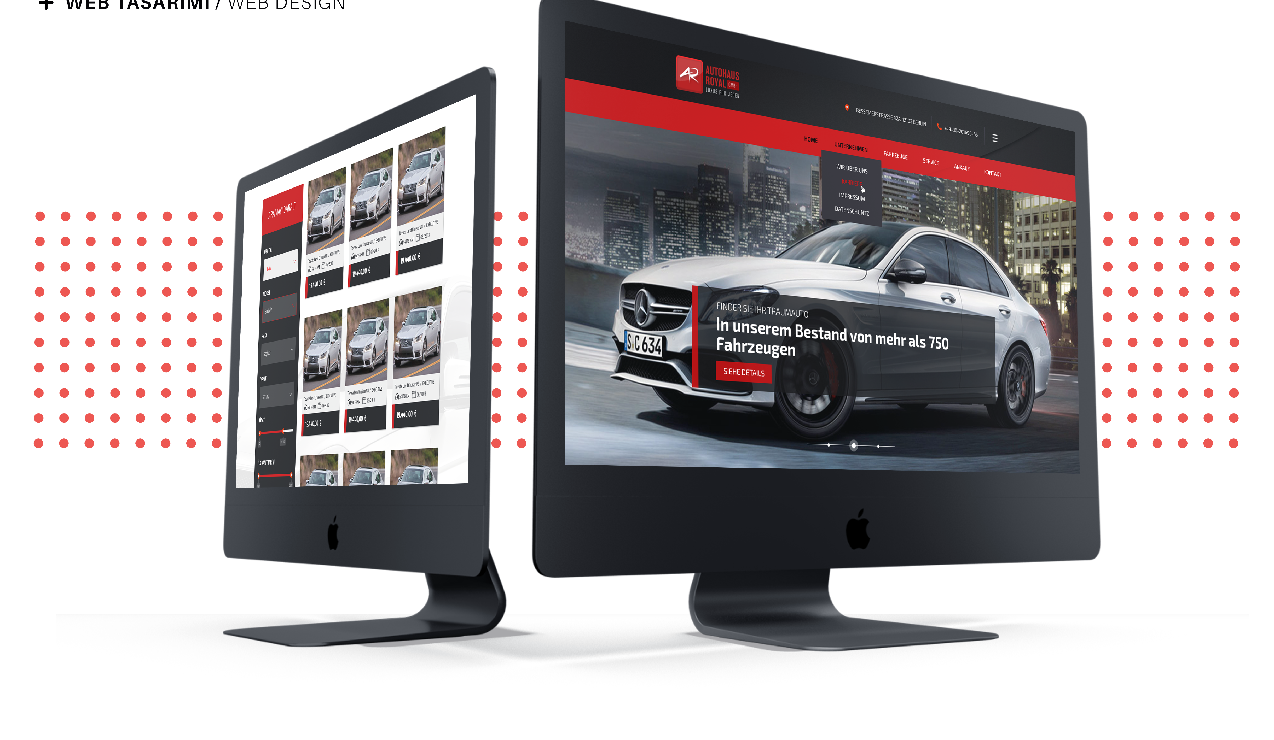 Berlin’in önde gelen araç bayilerinden Autohause Royal için web tasarım çalışmasında; firmanın sektörü ve kurumsal kimliği göz önünde bulundurularak modern çizgilerde bir tasarım oluşturulmuştur. Tasarımda sadelik ve kullanım kolaylığının yanı sıra firma marka değerinin yükseltilmesi ve bilinirliğinin arttırılması hedeflenmiştir.