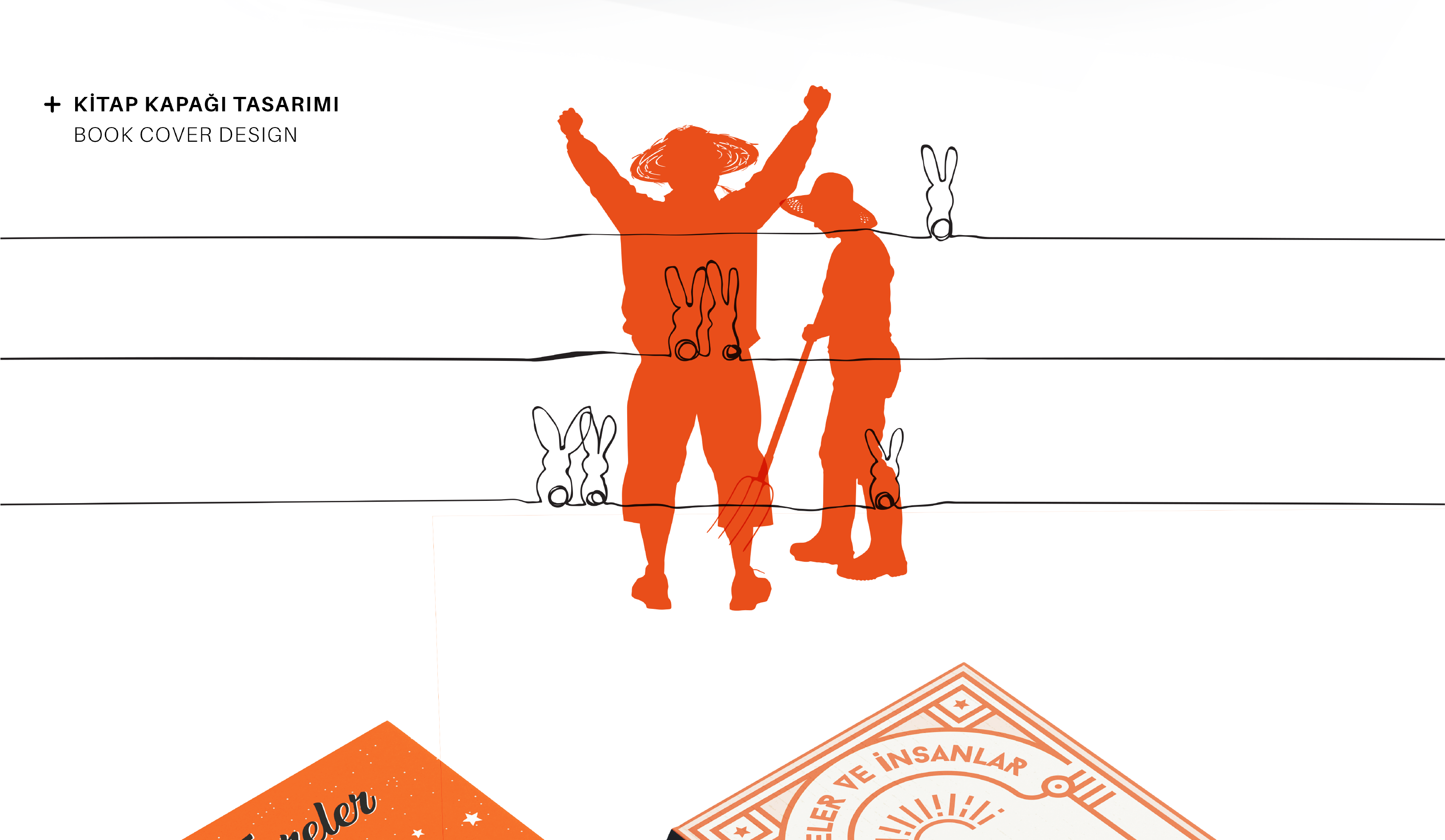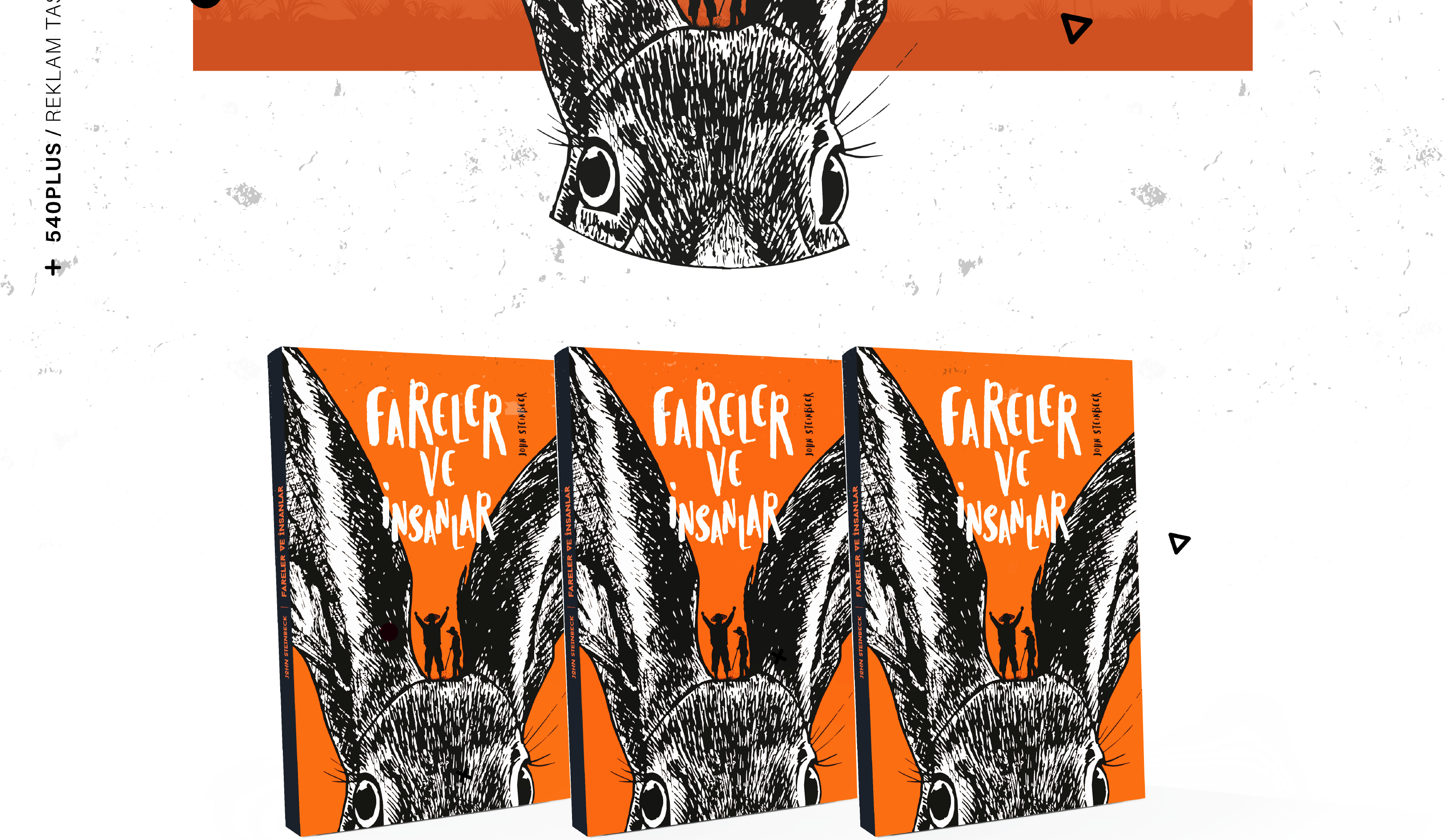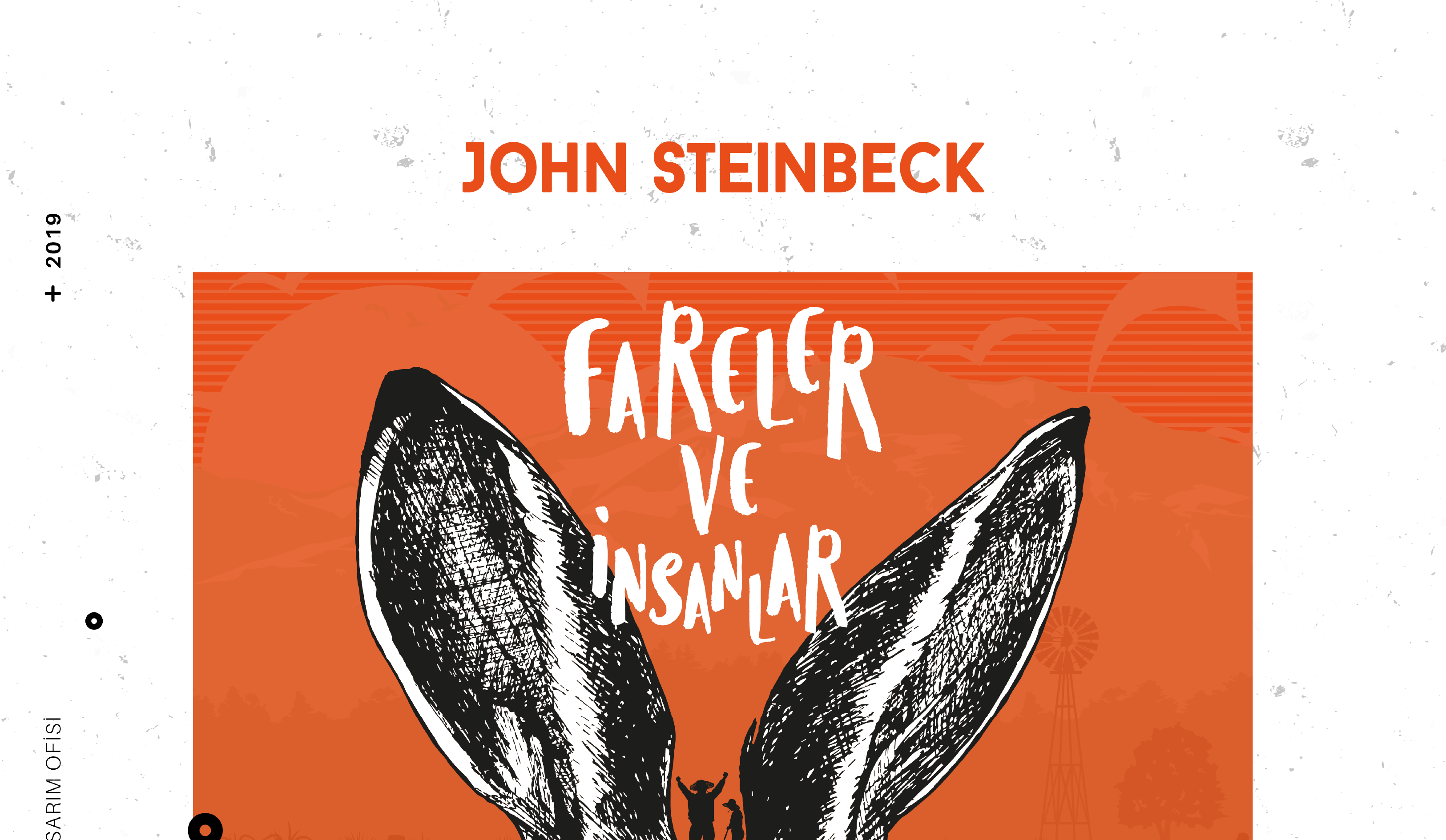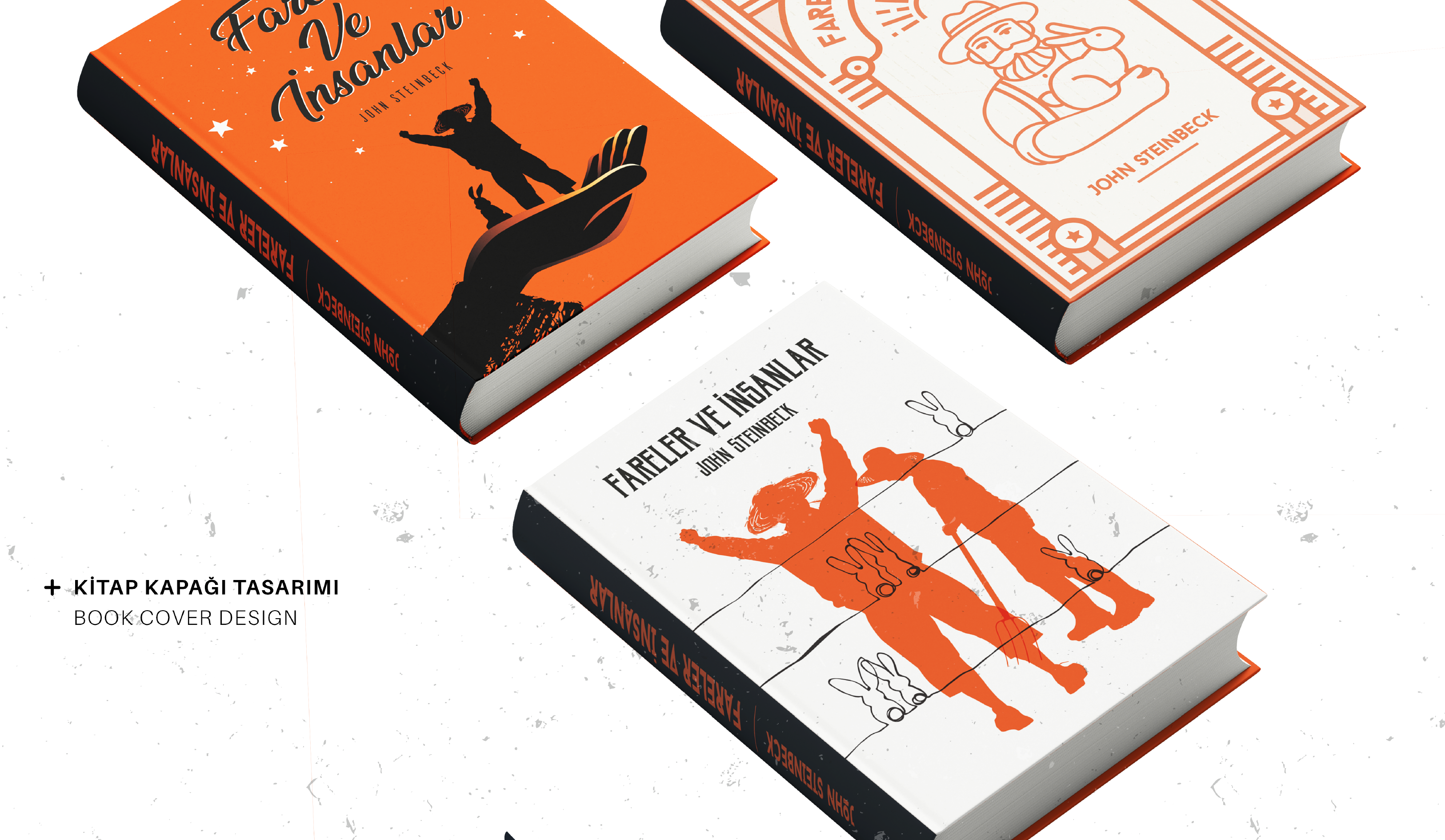 Fareler ve İnsanlar kitap kapağı çalışmasında, kitapta yer alan ana kahramanların ve kitapta önemli bir yol oynayan tavşan detayından yola çıkılarak çağdaş çizgilerle kapak tasarımı yapılmıştır.